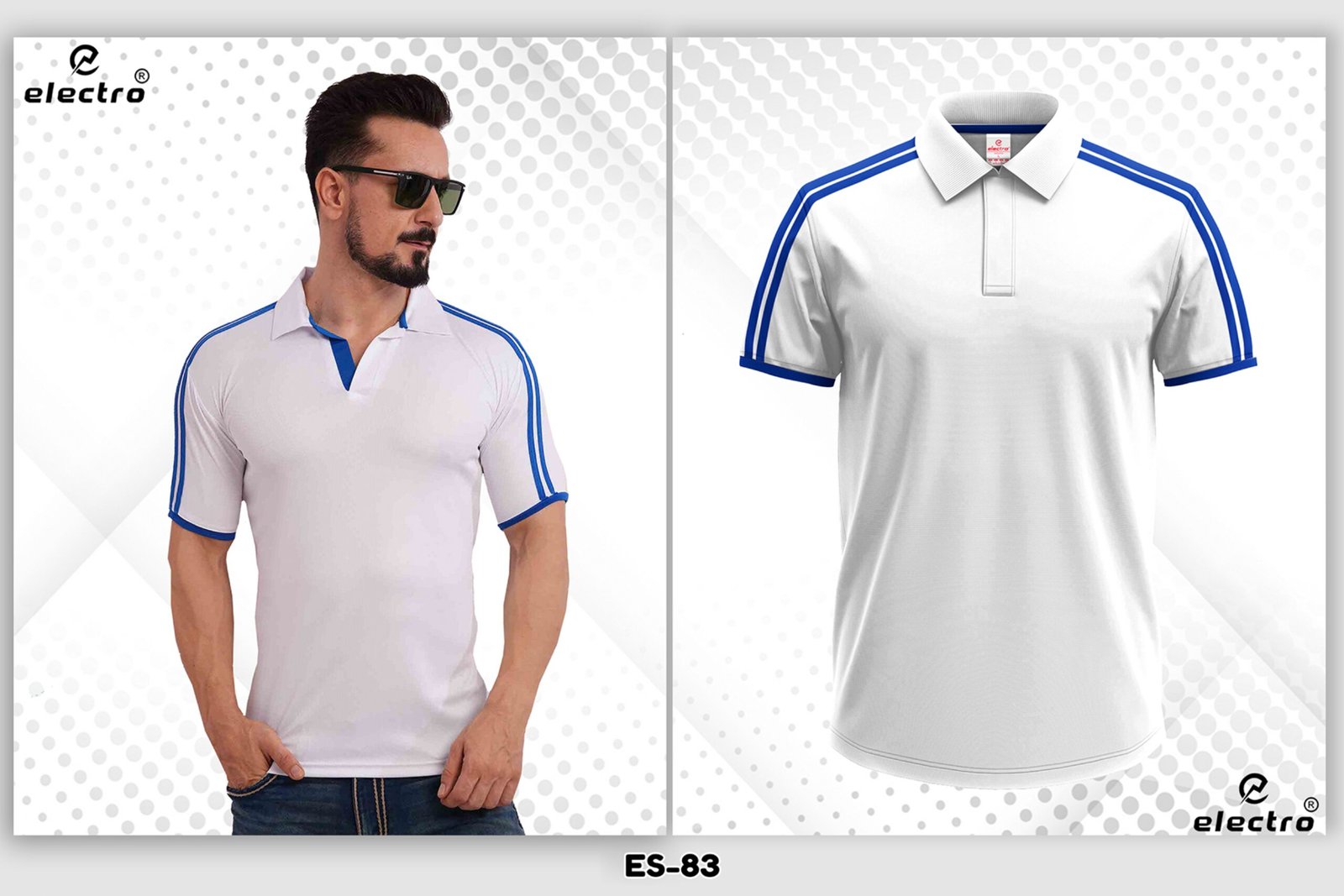 Looking for a clean and sporty white blue polo t-shirt Ahmedabad? The ES-83 design is a perfect choice. It offers a fresh color combination with excellent comfort. As a result, it is ideal for corporate uniforms, sports teams, and promotional branding.